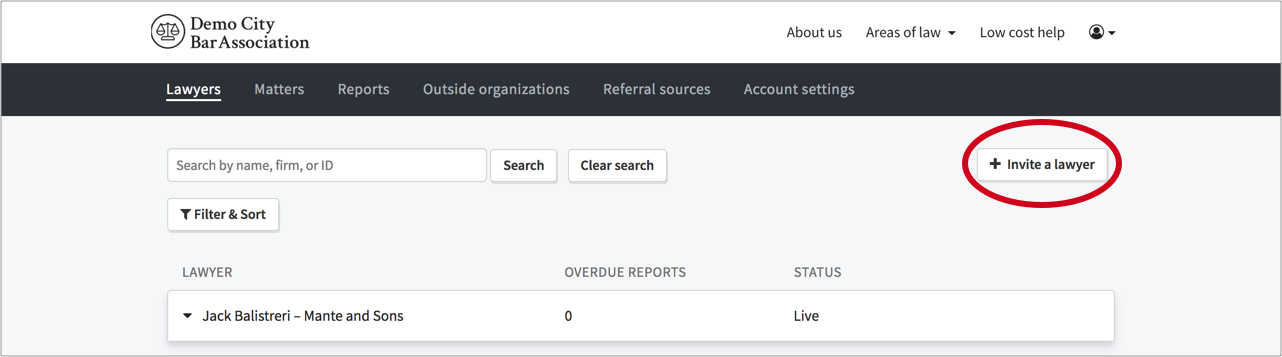 When you want to create an account for a lawyer in your portal, go to the “Lawyers” tab on your dashboard and click “Invite a lawyer”.