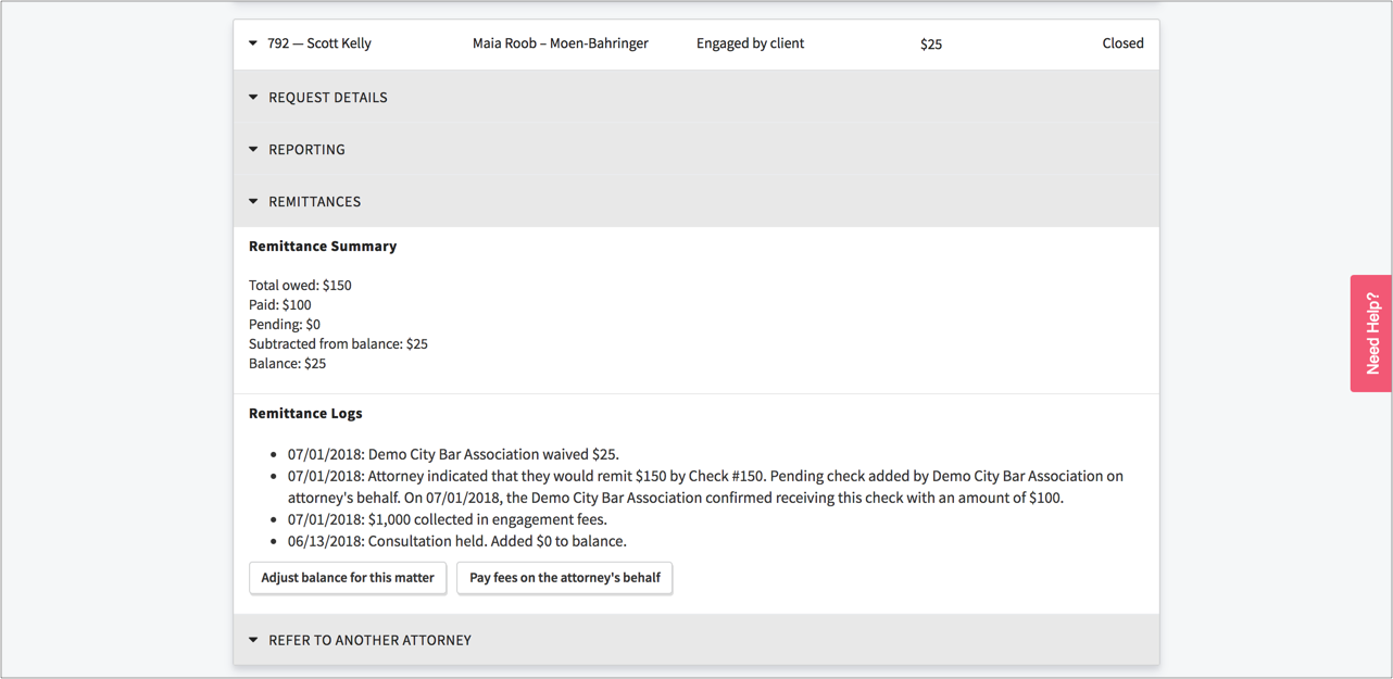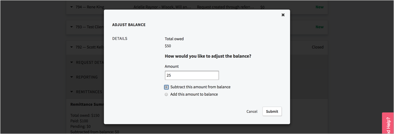 From your administrator account, you can adjust the balance on a matter by either subtracting/waiving the balance or adding to the balance. This is useful when, for example, a lawyer erroneously reports collecting client fees or an administrator erroneously confirms a check payment.
