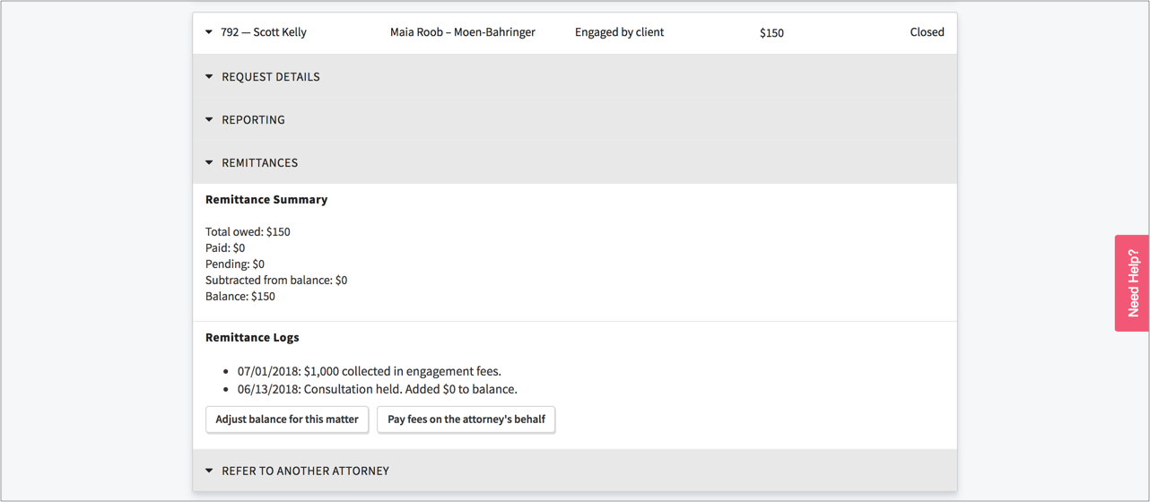 You can review information about the remittances owed, pending, and paid on each matter, as well as any adjustments that have been made to the balance of the matter. To view this information, go to the Matters tab, click a matter card to expand it, and then select the Remittances section header: